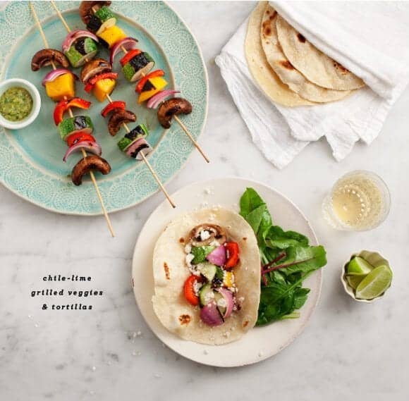 Chop veggies so that they are somewhat uniform in size and thread them onto the skewers. Sprinkle them with some salt and liberally brush the veggies with the chile-lime oil.