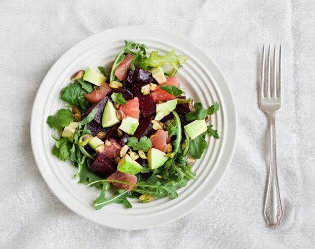This winter salad is a perfect combination of tart grapefruit, sweet beets, creamy avocado, and crunchy toasted pistachios. A great light lunch or dinner side, it's gluten-free with a vegan option.