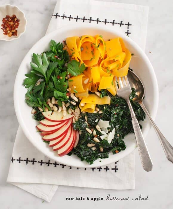 This kale salad is full of fall flavors from apple and butternut squash. A delicious Thanksgiving side or healthy autumn dinner!