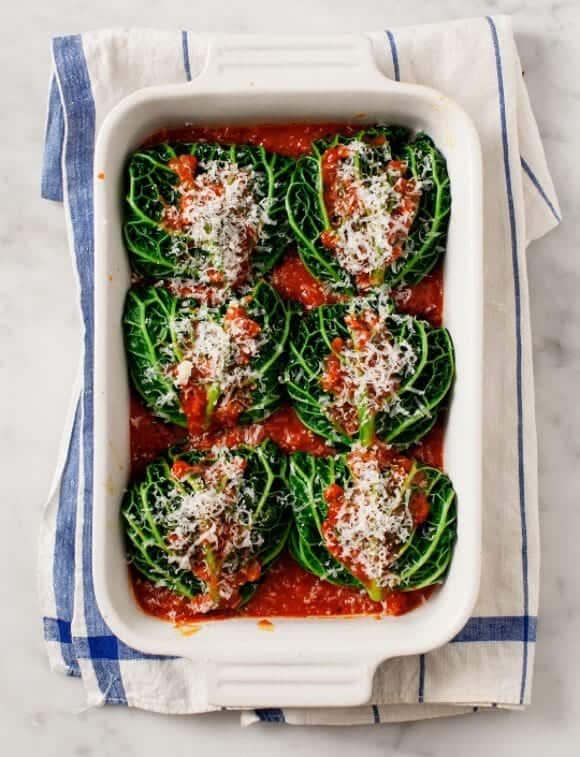 Scoop a few tablespoons of filling into each leaf. Gently tuck in the sides and roll them. Place them seam-side down into the baking dish. Top each with a generous spoonful of marinara and a drizzle of olive oil (and a grating of cheese if you're not vegan). Bake for 25 minutes.