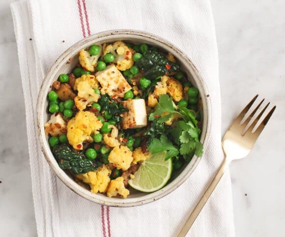 This simplified version of aloo gobi uses peas & kale to add pops of green to the classic Indian dish.