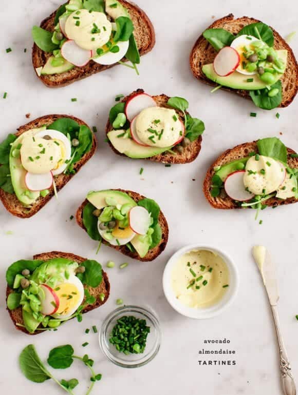 Assemble the tartines with your choice of toppings and top with a dollop of almondaise sauce.