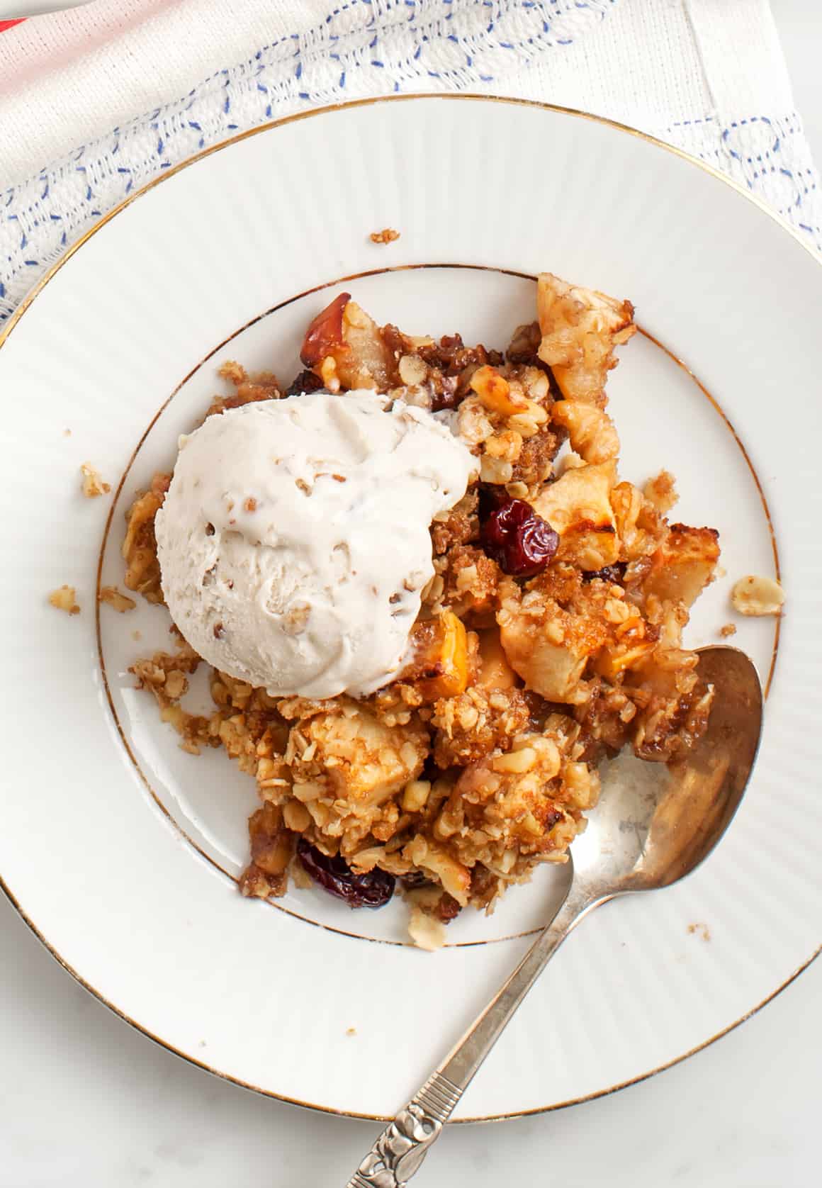 This delicious spiced apple crumble is easier than pie and can be made vegan and gluten-free! A great fall dessert.