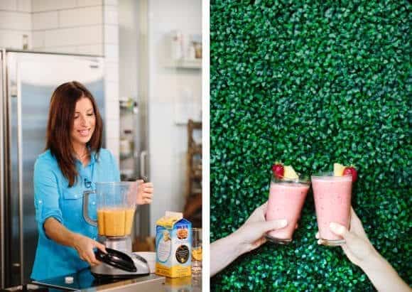 Add ½ cup Almond Breeze (any flavor) to a blender with a big handful of each fruit. Blend, adding more almond milk, as needed. Add a handful of ice, if desired.