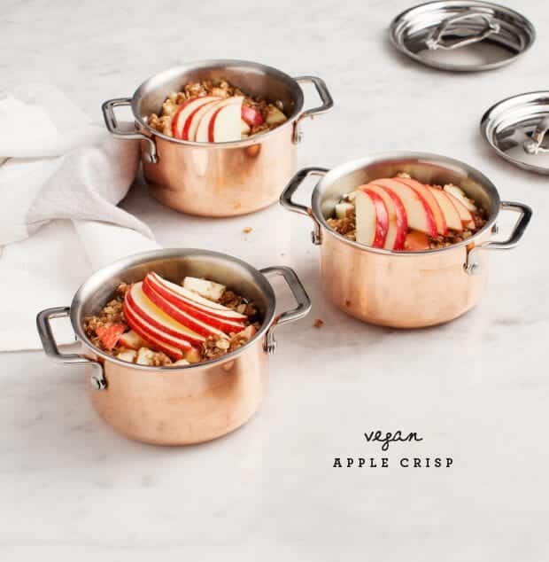 This easy vegan apple crisp is one of my go-to entertaining dishes. I like to make the crumble ahead of time and assemble and bake the crisps just before serving!