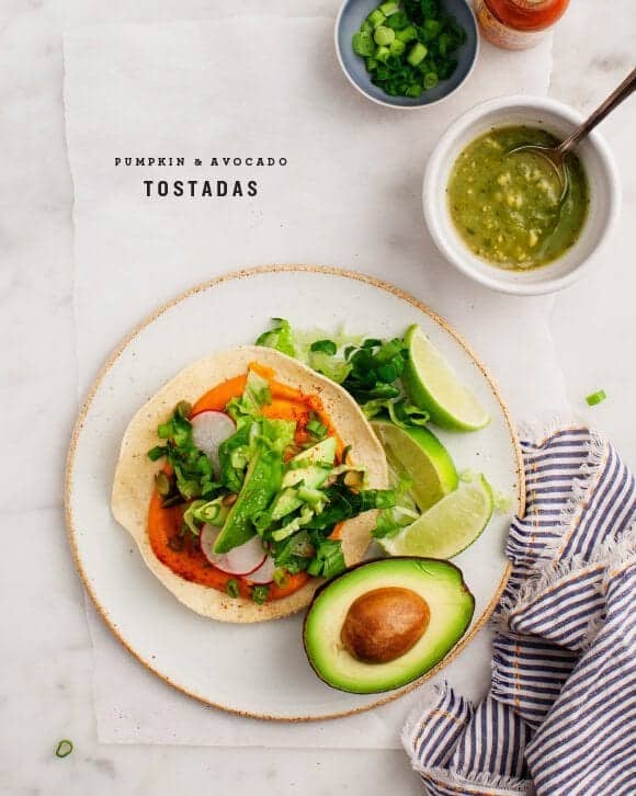 Assemble the tostadas with the pumpkin spread, lettuce, avocado slices, radish, scallions, and pepitas. Top with a pinch of sea salt and a squeeze of lime. Serve with extra lime slices, salsa, and hot sauce, if desired.