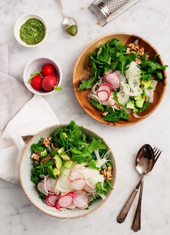 Assemble the salad with the arugula, marinated fennel & radishes, avocado, and walnuts. Add scoops of pesto or freshly grated parmesan cheese, if desired. Season to taste and serve.