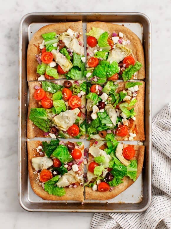 This healthy flatbread pizza recipe is a fresh, easy dinner! Classic Greek salad ingredients give it a fun combination of creamy, tangy, and crisp toppings.
