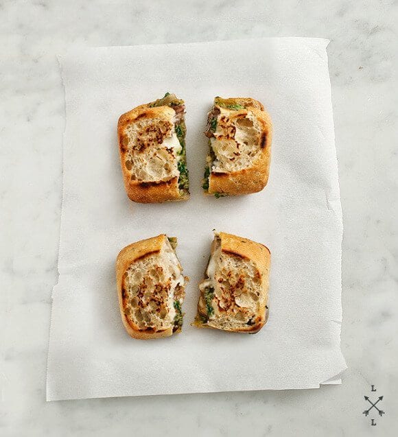 Assemble the sandwiches: I actually grilled these open faced - the side with the cheese longer (so the cheese could sufficiently melt), the side with the pesto, not as long (so the pesto wouldn't dry out or become bitter), and then put the 2 sides together, pressing down gently to get them to stick.