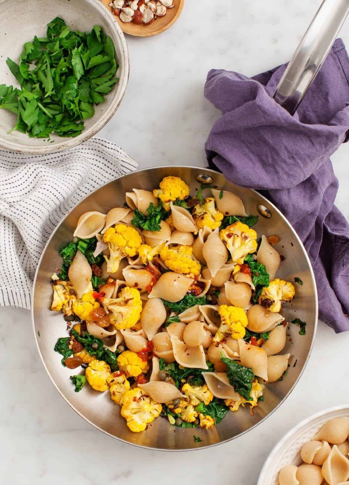 This roasted cauliflower pasta is one of my favorite easy cauliflower recipes! Golden raisins and capers add great salty/sweet flavor to this dish.