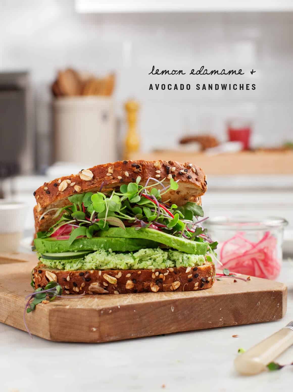 Spread the edamame sandwich filling on 4 slices of bread. Top with the cucumber and avocado slices, pickled onions, arugula and the remaining bread slices.