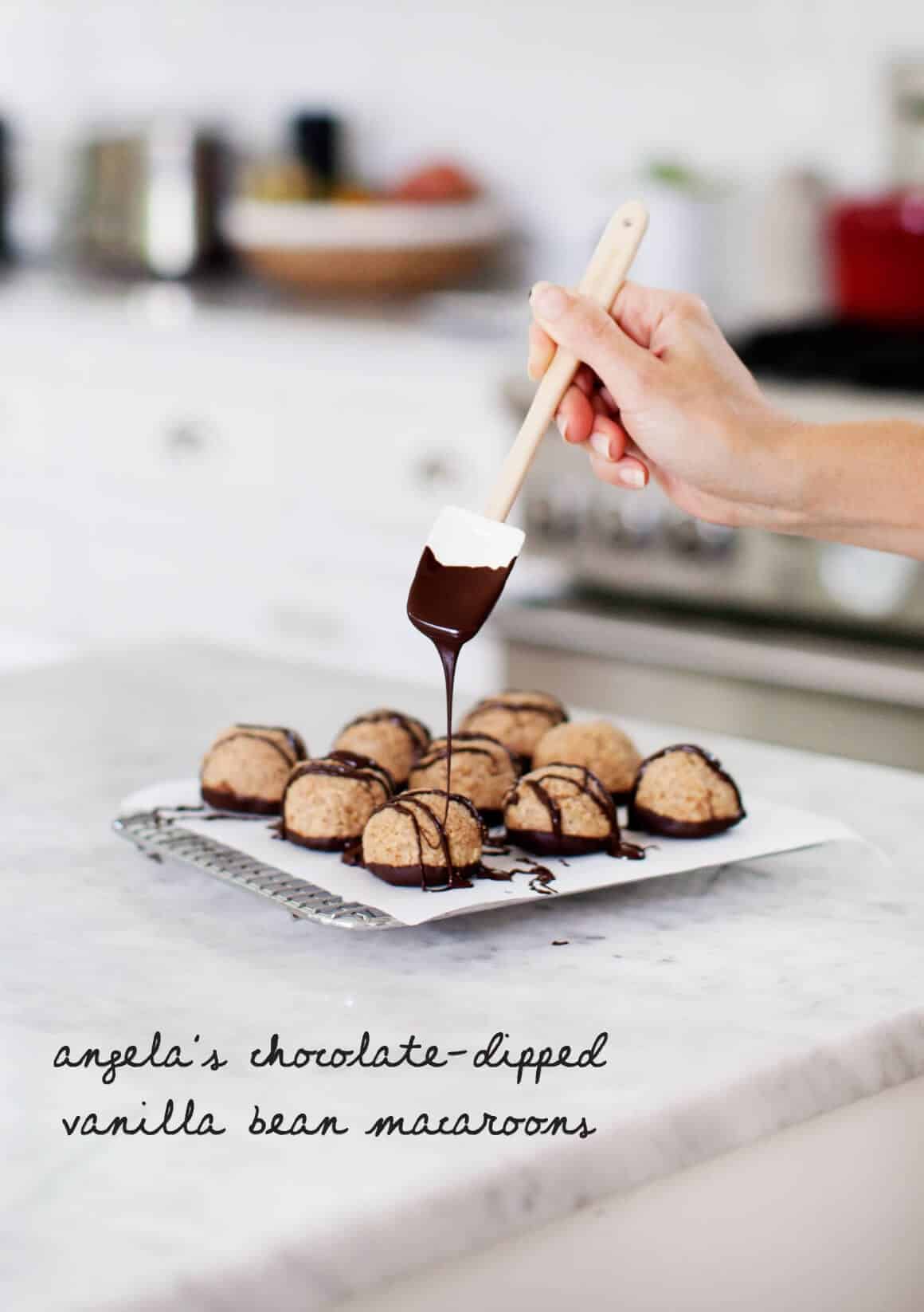 Dip the flat base of each cooled macaroon into the chocolate and twirl the macaroon until the base is coated in chocolate. As you dip them, place each macaroon onto the parchment paper-lined plate, upside down, so the chocolate coating is facing upward. Freeze the macaroons for 10 to 15 minutes, or until the chocolate has hardened.