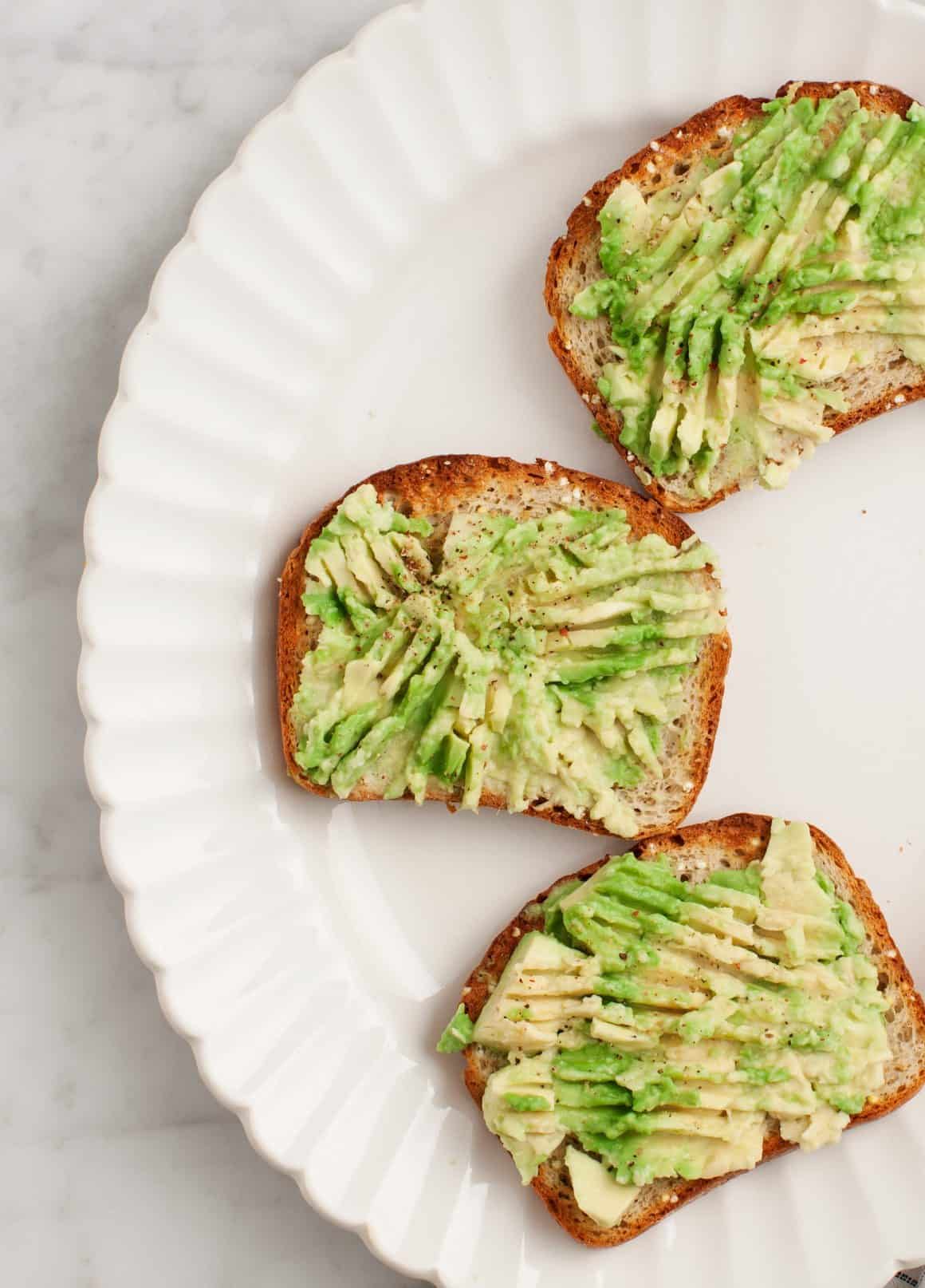 Slice the avocado in half and remove the pit. With the avocado still in its shell, use a paring knife to slice each half into cubes. Squeeze some lemon juice and a pinch of salt on both halves. Use a spoon to scoop the avocado out of the shells and onto the toasts, then smash down with the back of a fork.