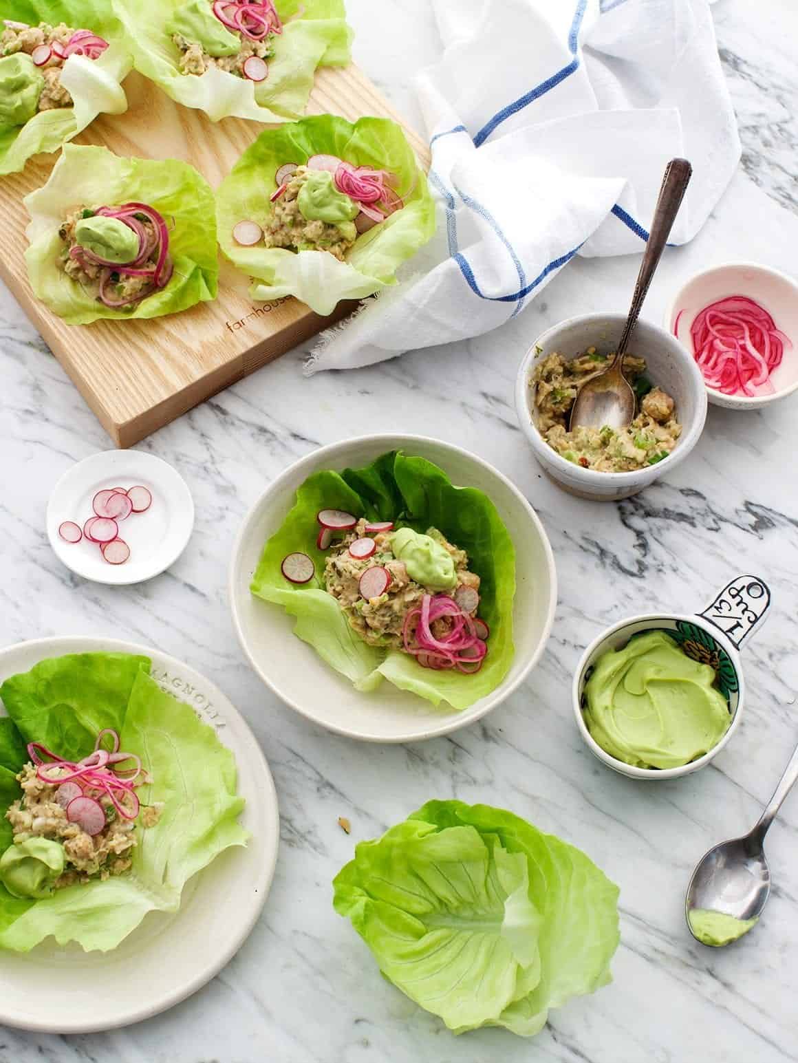 Assemble lettuce wraps with the chickpea salad, dollops of avocado dill sauce, radishes and pickled red onions.