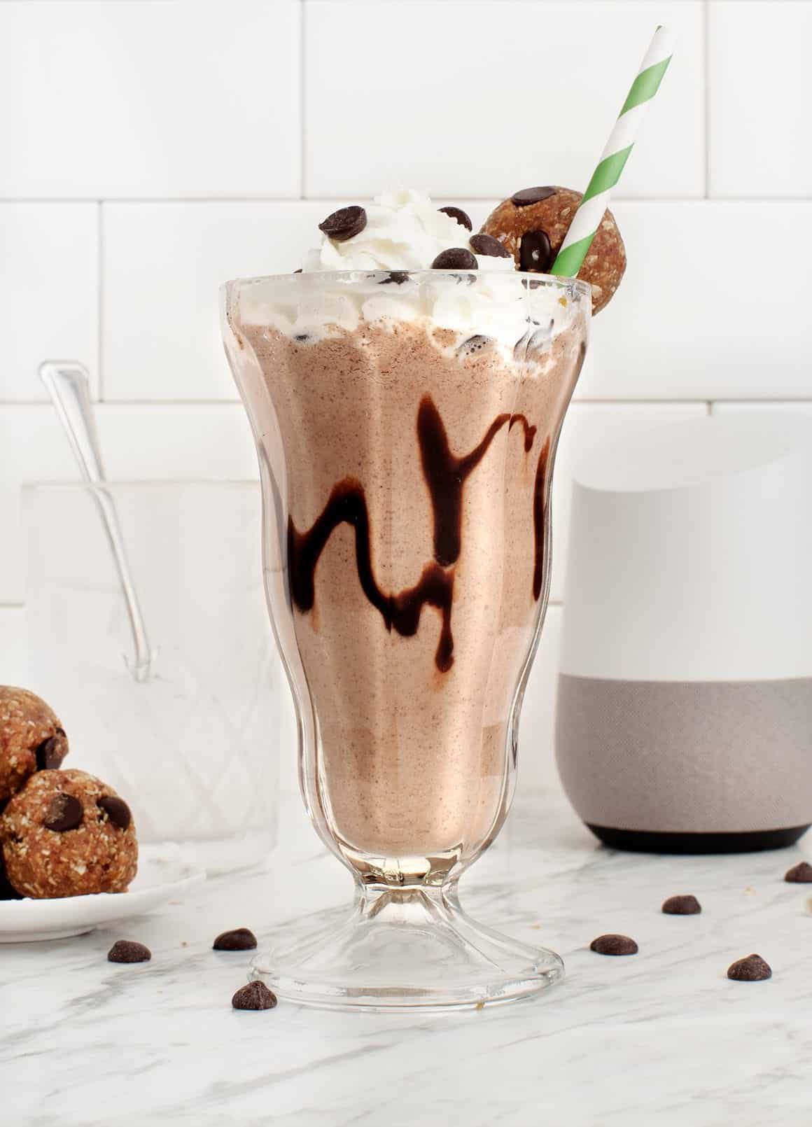 To make the milkshakes, combine 6 cookie dough balls with the almond milk and blend on high speed until smooth. Add a handful of ice and blend until combined. Add the ice cream and pulse 2 times just to combine. Don’t melt the ice cream. Pour into two glasses and garnish each with a cookie dough ball and with desired toppings.