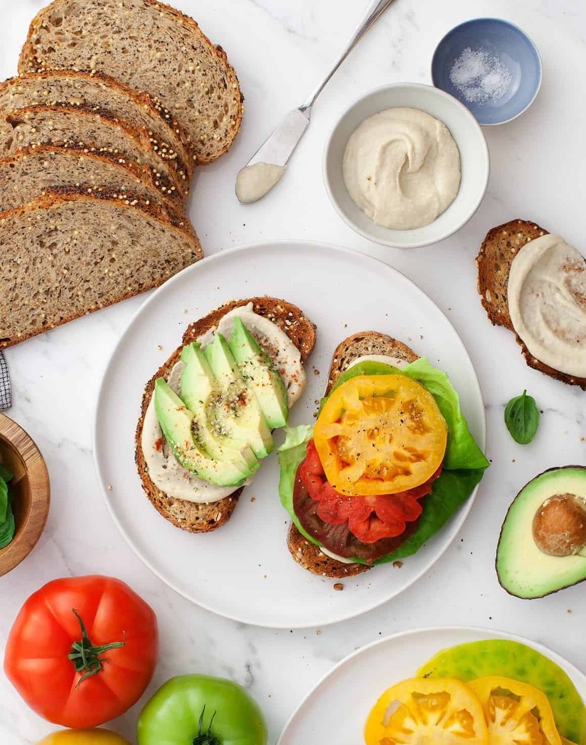 This tomato sandwich gets a delicious tangy kick from creamy white bean spread. I add basil for fresh flavor and lettuce and avocado for extra veggie goodness. Perfect for a summer picnic!