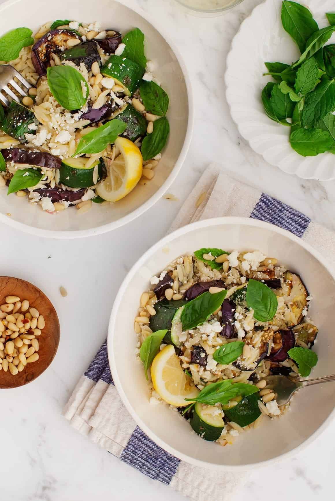 Grill the eggplant for 4 to 5 minutes per side, or until tender and charred, and the zucchini for 4 minutes per side, or until nice char marks form. Let cool slightly, then chop and add to the large bowl. Add the lemon juice and toss. Stir in the feta, herbs, and pine nuts, reserving a bit of each for garnish. Taste and adjust seasonings.