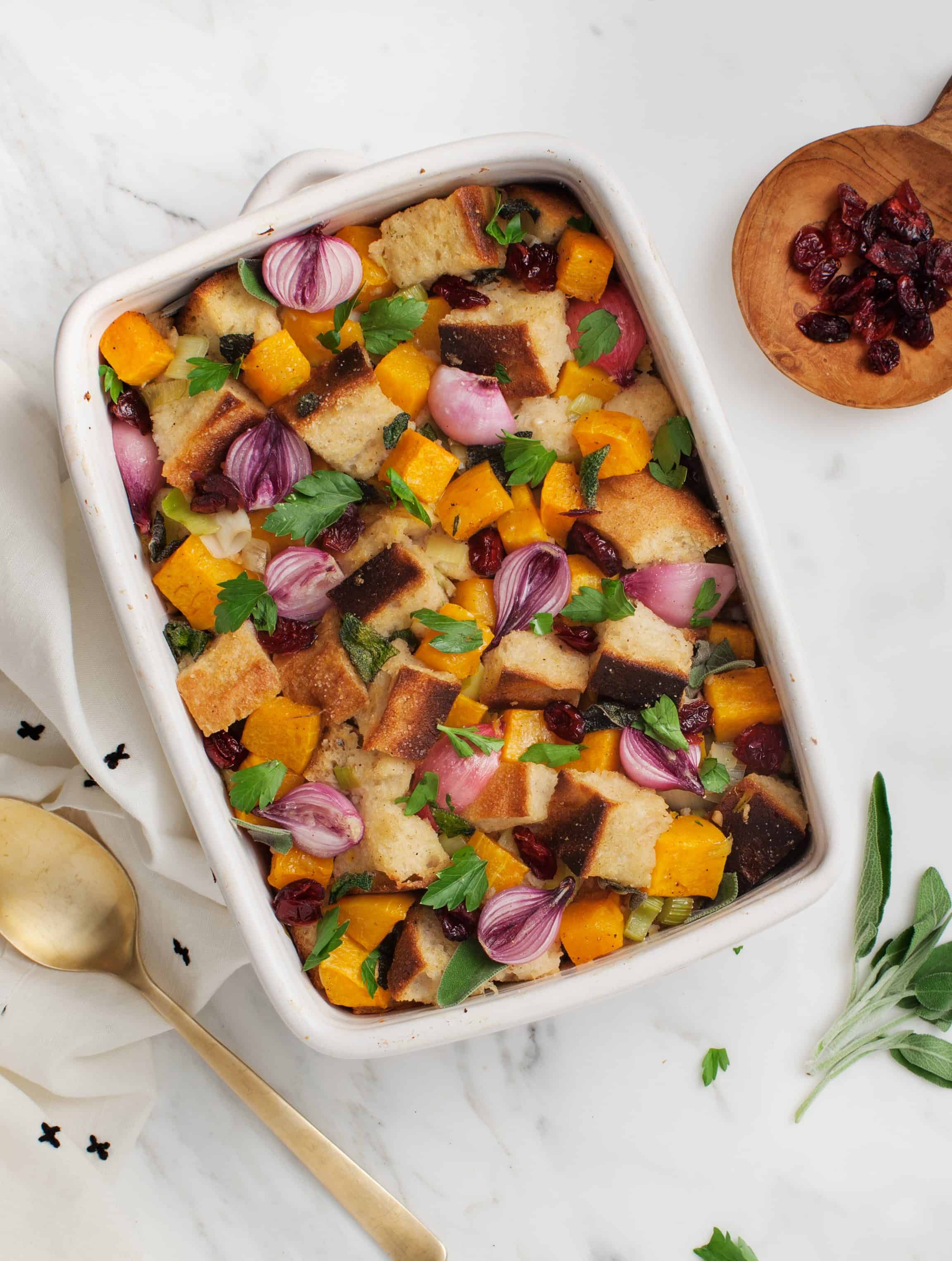 This butternut squash casserole recipe is a fresher take on classic bread stuffing. I love to serve it at Thanksgiving, but feel free to enjoy it all fall and winter long.