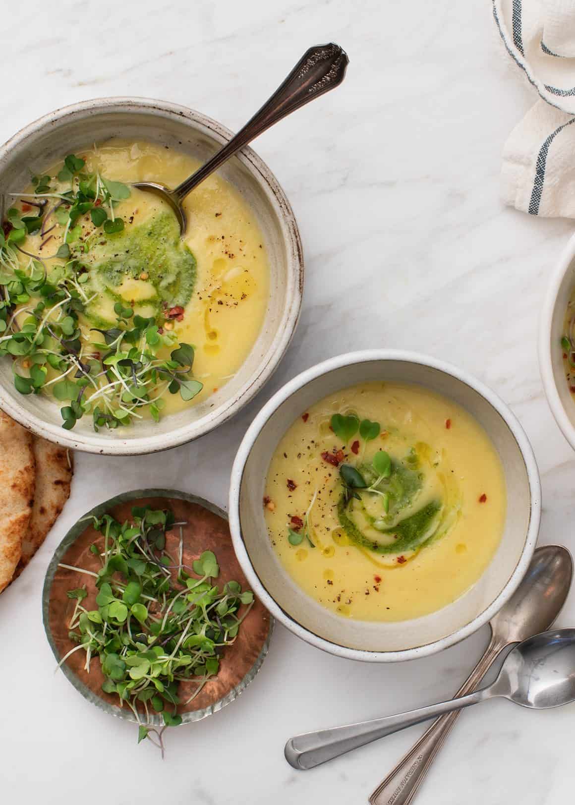 Scoop into bowls and serve with swirls of the Creamy Kale Pepita Pesto.* Top with the microgreens and red pepper flakes, if desired. Serve with naan bread.
