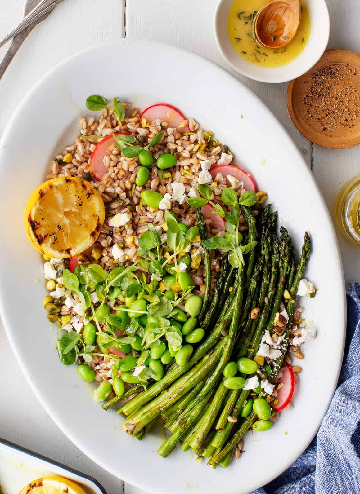 Remove the asparagus and lemons from the grill. Assemble the salad with the dressed farro, the asparagus, edamame, cheese, capers, radishes, pea shoots, and pistachios. Drizzle with more dressing, as desired, and squeeze the grilled lemon over the salad. Season with more salt and pepper, as desired.
