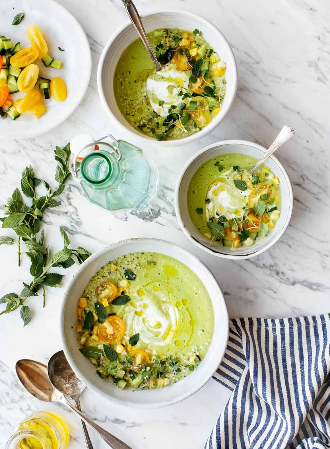 You'll love this tart, spicy cucumber gazpacho! I topped mine with charred corn, tomatoes, hemp seeds, and a yogurt drizzle, but cilantro, avocado, and tortilla strips would be excellent choices too.