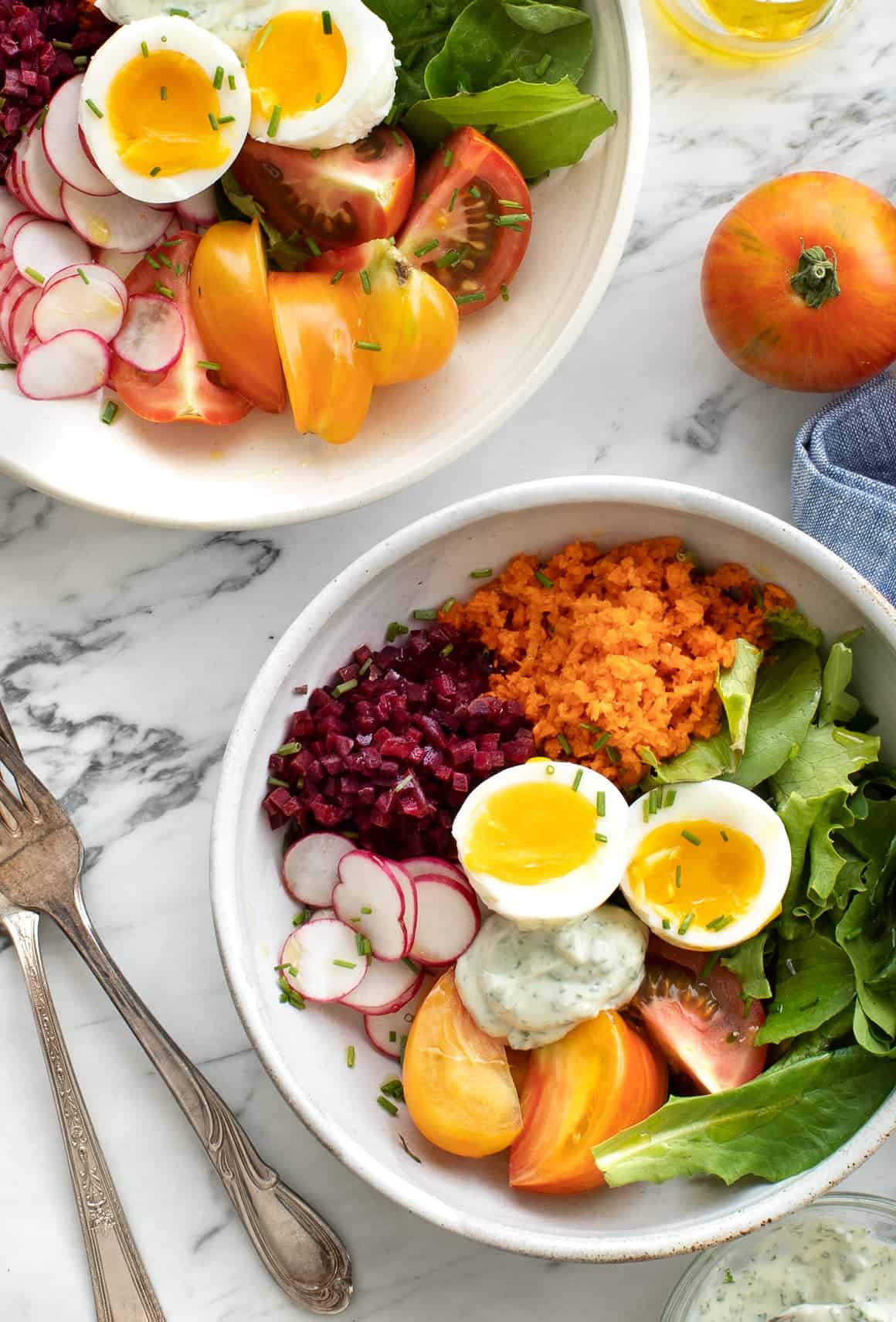 Assemble the bowls with the salad greens, carrots, shredded beet, radishes, tomatoes, and soft-boiled eggs. Drizzle the bowls with olive oil and season with salt and pepper. Serve with dollops of the yogurt sauce.