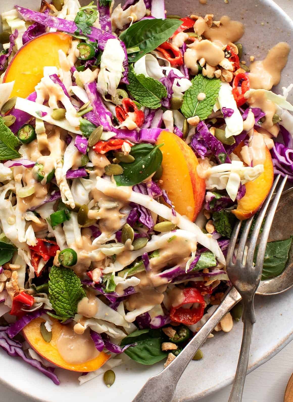 In a large bowl, combine the cabbage, peppers, scallions, cilantro, basil, chiles, and ¾ of the dressing. Toss until combined. Add the remaining dressing, if desired, and season to taste with a few pinches of sea salt. Serve topped with the toasted nuts, seeds, and sliced peaches.
