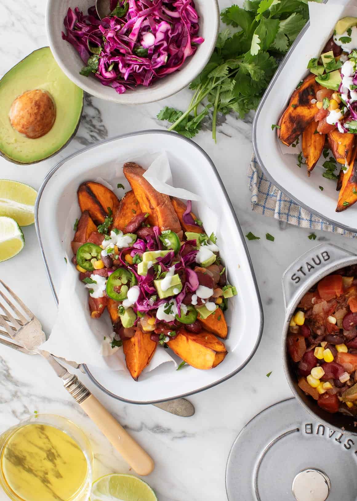 Assemble the chili fries with a layer of sweet potato wedges and a scoop of chili. Top with the slaw, avocado, and jalapeño and yogurt sauce, if using. Serve with lime wedges and garnish with cilantro.