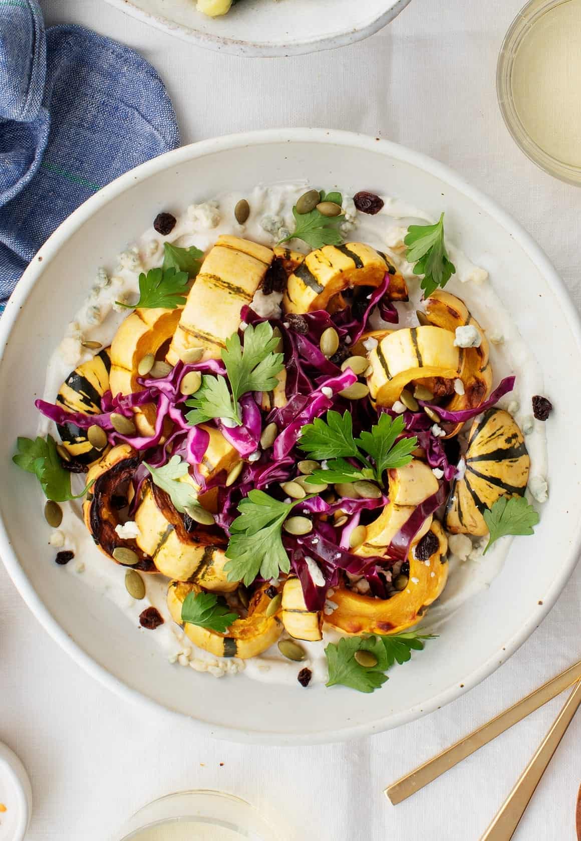 This roasted delicata squash makes an excellent vegetarian Thanksgiving side. Roast the squash and marinate the cabbage ahead of time to easily assemble this dish before the big meal.