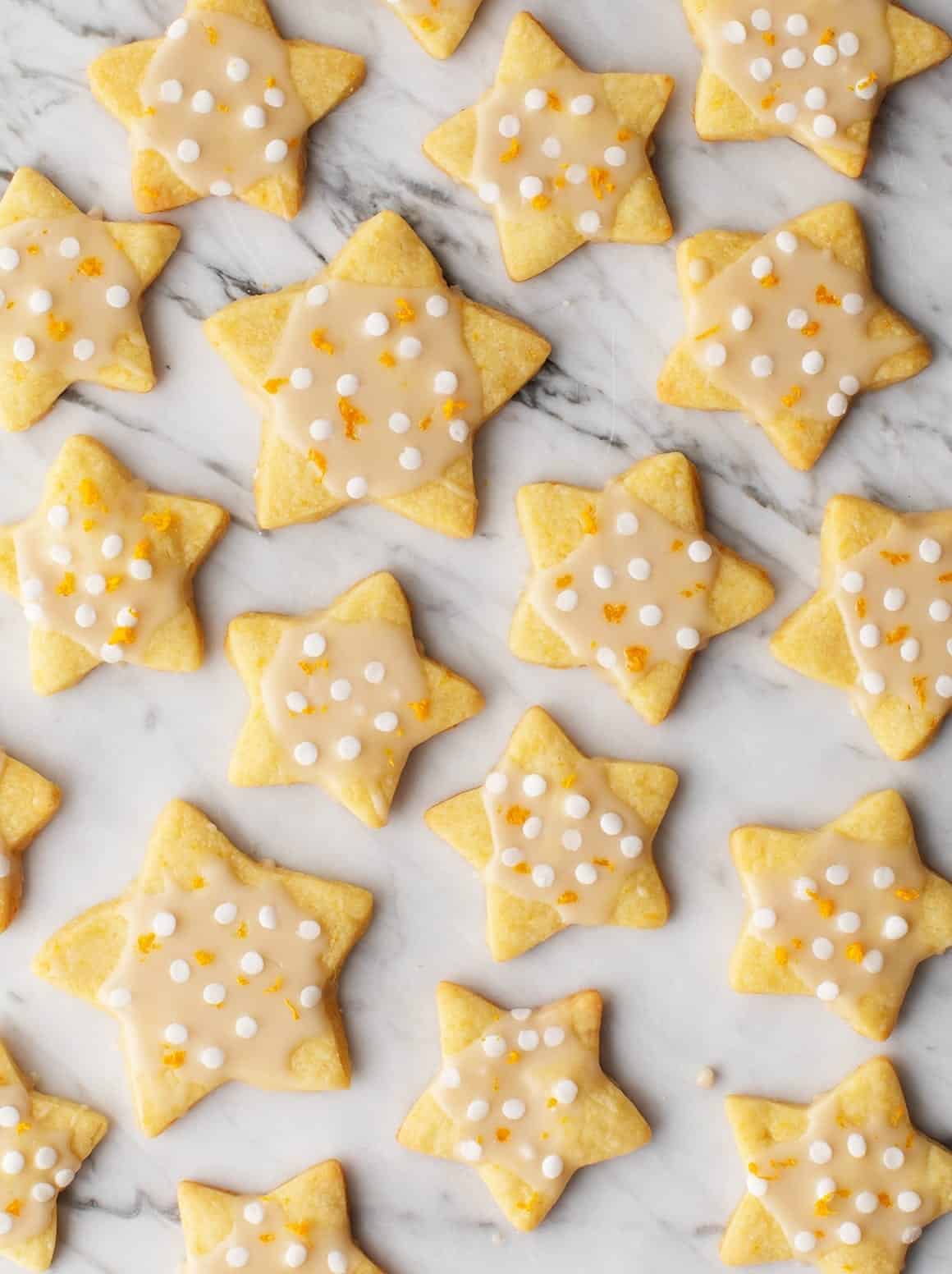 Make the glaze. Whisk the powdered sugar and almond milk until smooth. Drizzle over the cooled cookies and decorate them with sprinkles, if using, and orange zest.