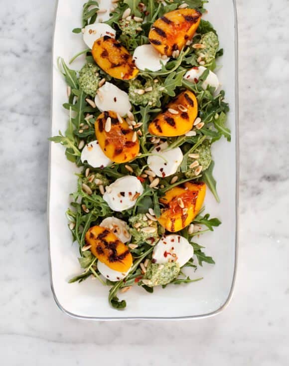 Toss the arugula with a little bit of olive oil and a few pinches of salt. Assemble on a platter and top with the mozzarella slices, peaches, dollops of the pesto, a sprinkle of pine nuts, and a few pinches of red pepper flakes. Squeeze a bit of lemon on top and serve.