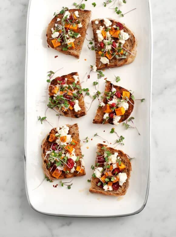 Assemble the toasts with sweet potatoes, feta, cranberries, and chopped sage. Top them with a generous drizzle of honey and some more olive oil if you wish. If you like, add a few micro sprouts and little pinch of red pepper flakes, and serve.