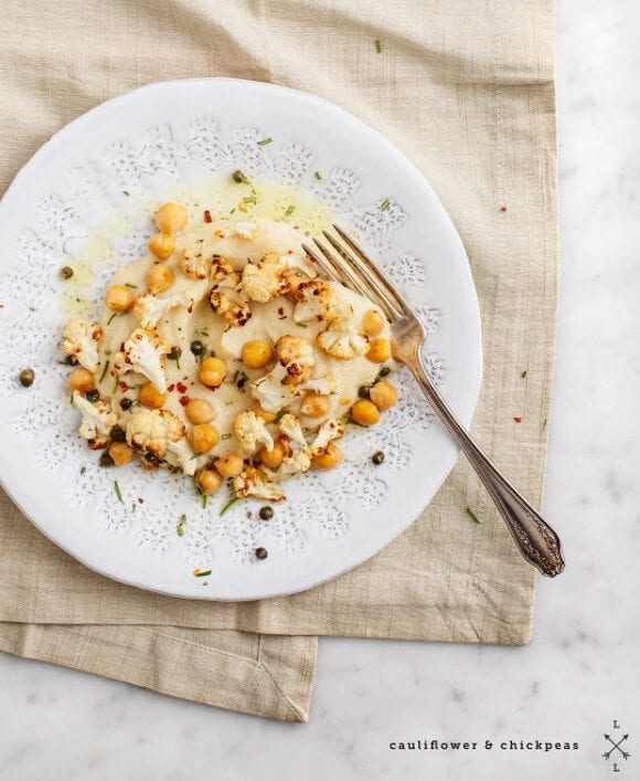 Plate with a generous scoop of the puree and top it with the roasted cauliflower, chickpeas, a drizzle of olive oil, capers, a few small pinches of red pepper flakes, and another pinch of rosemary. And an extra squeeze of lemon if necessary.