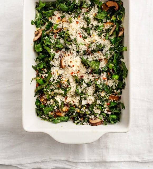 In a medium skillet heat the oil. Add the mushrooms and a few pinches of salt. Cook, stirring occasionally until they’re golden and soft. Remove from pan and set aside.