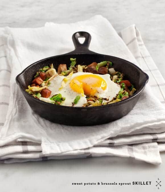 This Sweet Potato & Brussels Egg Skillet is a simple, healthy vegetarian dinner or brunch! This flexible, easy recipe is also gluten-free.