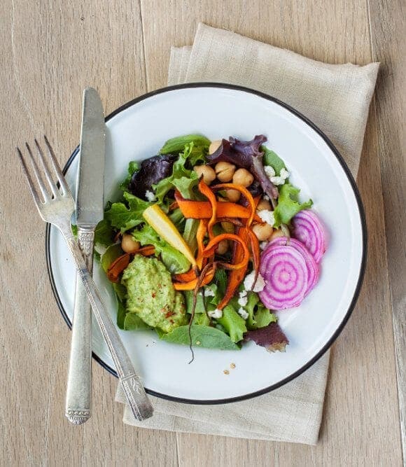 Make the salad: Toss the spring greens with a little olive oil, lemon juice, salt & pepper. Add the chickpeas, feta, sliced beets and roasted carrots to the salad. Top with a spoonful of hummus and serve.
