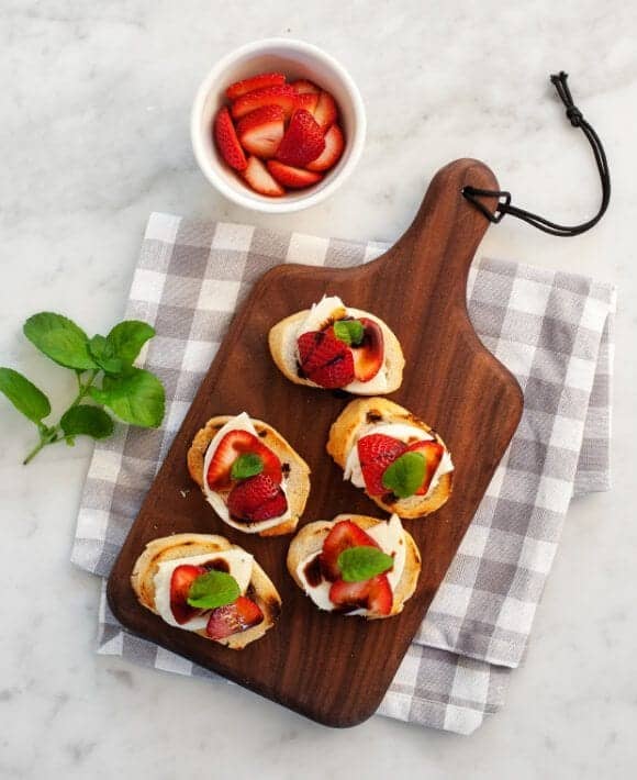 Assemble crostini with a piece of mozzarella, strawberries, a drizzle of the reduced balsamic and fresh mint.